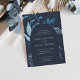 Notre faire-part de mariage Winter Azure entoure vos détails de jour de mariage avec une arche de feuillage aquarelle dynamique. Un choix moderne mais organique pour les mariages d'hiver ou de printemps avec des éléments botaniques peints de manière complexe. Colorway : Winter Azure, un mélange de bleus gelés sur un arrière - plan de la marine.