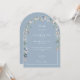 Un élégant faire-part de mariage fleur sauvage à arche fleurie aquarelle qui encadre vos détails de célébration mariages, dans une élégante typographie blanche sur un arrière - plan bleu poussiéreux. Conçu par Thisisnotme©