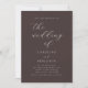 Cette invitation de mariage présente une grande écriture cursive qui indique "le mariage de" sur un riche fond brun mocha, avec les noms des mariés en lettres majuscules espacées et les détails de l'événement dans une police délicate de style machine à écrire en dessous. La palette crème sur fond sombre lui donne une élégance moderne et sombre qui convient parfaitement aux mariages d'automne ou d'hiver.
