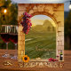 Un faire-part de mariage peint d'art sur le thème du vignoble. Cette invitation présente un paysage de style italien avec un arc romain, des raisins, du vin et un tournesol. Vous pouvez remplacer l'image du paysage par une image personnalisée si vous le souhaitez. Il est également possible de remplacer l'image avant par votre propre texte. Tous les textes à l'arrière peuvent être customisés, y compris le changement de polices, la taille des polices et plus encore. Pour toutes les options de customise, choisissez "customiser".