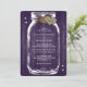Faire-part de mariage violet rustique avec un bocal de maçon et des coeurs de burlap avec initiales sur un arrière - plan de bois de grange.