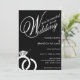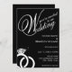 Elégant faire-part de mariage noir et blanc avec bague en diamant brillant. Personnalisez-le avec les détails de votre événement.