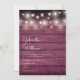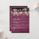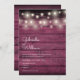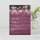 Un élégant faire-part de mariage rustique avec de jolies lampes à cordes au-dessus des noms du couple heureux, dans un élégant script au-dessus des détails mariages spéciaux sur un arrière - plan rustique en bois rouge bordeaux. L'envers est assorti à un arrière - plan en bois rustique. Conçu par Thisisnotme©