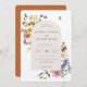 Fleur et feuillage de prairie sauvage, faire-part de mariage. Arche fleur sauvage aquarelle avec support en terre cuite de couleur orange de rouille. L'invitation présente un style design typographique chic mélange de calligraphie et de type audacieux.