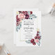 Une invitation à un mariage moderne et élégante, avec un thème bordeaux et rose fleuri, avec des fleurs d'aquarelle et de la verdure. Les rose bleus contrastent avec les fleurs violettes lisianthus, les oeillets bordeaux et les roses et l'ensemble offre un design classe pour un couple moderne, avec une pop de luminosité provenant de belles fleurs lisianthus crème.