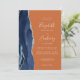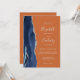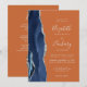 Le bord gauche de cette élégante faire-part de mariage moderne est orné d'une bordure en aquarelle bleu marine ornée d'une parties scintillant en faux argent. Le texte personnalisable combine écriture manuscrite, copperplate et italique fontes en gris argenté clair sur un arrière - plan orange brûlé ou rouille. L'envers offre de l'espace pour les détails mariages sur un arrière - plan solide rouille, ainsi qu'un code QR que les clients peuvent scanner pour visiter votre site Web et RSVP, qui économise le coût d'impression et d'envoi de cartes RSVP séparées.