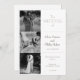 Présentez votre journée de mariage avec cette faire-part de mariage de collage photo sophistiquée et sincère. Ce design présente un design contemporain qui allie l'élégance de la papeterie mariage classique à la touche moderne de la photographie personnelle. Le panneau gauche présente trois emplacements photo soigneusement arrangés, permettant aux couples d'afficher des moments significatifs et chéris. Le panneau droit conserve un design minimaliste et élégant pour le texte, avec des noms dans une police de script délicate et des détails essentiels dans une police serif et élégante. La palette de couleurs neutres noir et blanc exhale une sophistication intemporelle et complète tout thème mariage, du classique au moderne. Cette invitation est parfaite pour les couples à la recherche d'une façon unique et personnelle de partager leurs détails mariages tout en gardant un air d'élégance sobre. note : remplacez la photo par vos photos de la séance photo pré-mariage. M004