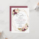 Invitation pour une fête de couples avec des florales de couleur bordeaux et blush peintes à la main et accentuées de verdure, un cadre géométrique doré et des points dorés.