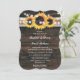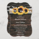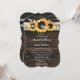 Faire-part de mariage de tournesol rustique avec des tournesols et des lampes à cordes contre un arrière - plan en bois rustique orné de burlap et ruban de dentelle. Deux coeurs de burlap à l'arrière. Personnalisez facilement cette carte de mariage de tournesol avec vos détails mariages.