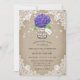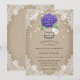 Des invitations à un mariage d'hydrangée violette rustique avec une hydrangée et un bouquet d'haleine pour bébé à l'intérieur d'un bocal de mason sur un burlap et un arrière - plan de dentelle fleurie. Un design de carte parfait pour inviter vos invités à votre mariage campagnard violet rustique inspiré des fleurs d'hydrangée. Carte facile à personnaliser.