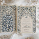 Cette faire-part de mariage sophistiquée allie l'élégance intemporelle du bleu marine à la douceur de la crème, présentée par un magnifique design de dentelle islamique. L'invitation présente un arrière - plan bleu marine détaillé aux motifs de dentelle crème, faisant écho à l'art complexe que l'on retrouve dans les motifs islamiques traditionnels. L'arche architecturale en haut du côté avant encadre élégamment les détails mariages, écrits dans une teinte crème complémentaire. Le dos poursuit le thème avec une colonne de longueur complète du motif en dentelle, laissant de l'espace pour des informations supplémentaires ou un message personnel. Ce design, enraciné dans la beauté culturelle, est un choix impeccable pour les couples qui souhaitent faire une déclaration d'élégance et d'héritage.