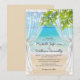Cartons d'invitation de mariage à thème de plage tropicale avec un décor estival de bord de mer, draperies de soie élégantes, feuilles de palmier, lumières scintillantes et modèle de mariage moderne facile à personnaliser.
