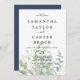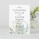Ce faire-part de mariage verdoyant de feuillage défraîchi en été est parfait pour un élégant mariage du milieu de l'été. Le design botanique présente un agencement luxuriant d'eucalyptus couleur aquarelle peint, de verdure et de feuilles verts avec de subtils ressorts de fleurs rose vif superposés avec votre texte.