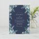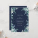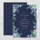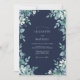 Un fond bleu marine profond donne le ton à ce design sophistiqué, mettant en vedette des botaniques aquarelles éthérées. Des fleurs sauvages délicates de teinte sarcelle et vert sauge, ainsi que du feuillage aéré et des fleurs douces, créent une esthétique forestière naturelle. Cette palette élégante capture une atmosphère sereine et picturale pour une soirée ou un événement hivernal saisonnier.