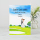 Une invitation de mariage de golfeur magnifique pour votre grand jour ! La mariée et le marié se tiennent ensemble sur un beau terrain de golf, heureux et amoureux. Sauvegardez la date et invitez vos amis et votre famille à célébrer votre union !