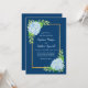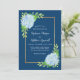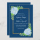 Ces invitations de mariage présentent un design floral moderne avec des fleurs d'hydrangée bleue, des feuilles, du feuillage et une bordure en faux or sur un arrière - plan bleu marine. Personnalisez-les avec votre propre texte.