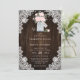 Invitations de mariage floral rustique avec respiration pour bébé et bouquet de rose à l'intérieur d'un bocal de maçon contre un arrière - plan en bois de grange orné de dentelle fleurie blanche et de lampes à cordes. Un design de carte parfait pour inviter vos invités à votre mariage rustique et roux. Conception entièrement personnalisable.