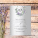 Un arrière - plan faux argenté. Une couronne fleurie faite de fleurs de lavande et de verdure d'eucalyptus aquarellée. Personnalisez et ajoutez vos initiales, noms et détails monogrammes. Texte noir.