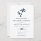 Cette simple invitation de mariage à la plage tropicale minimaliste comprend deux palmiers en haut, avec un texte classique élégant, dans un schéma de couleurs blanc et bleu marine, avec coordination bleu marine sur le dos.