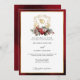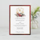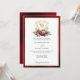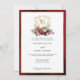 Le design mariage est intemporel, élégant et festif, sur le thème des fêtes, et présente une crête florale en or dessinée à la main, accentuée par un spray coloré de fleurs et verres de Noël rouges et blancs. Ce modèle formel personnalisé comprend des champs de texte modifiables ainsi que des graphiques de calligraphie personnalisés et une bordure en or texturée. La bordure extérieure et l'arrière présentent un arrière - plan opulent de velours rouge rubis.