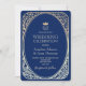 Élégant et formel, ce faire-part de mariage bleu marine et or est doté d'un monogramme royal avec couronne d'or, entouré de frontières botaniques complexes de style feuille. Parfait pour une célébration mariage traditionnelle et luxueuse, il met en valeur les initiales du couple et les détails de l'événement avec typographie classique. Idéal pour les affaires de cravates noires ou les mariages de soirée haut de gamme. Customisez avec vos propres nom, date et emplacement pour une touche intemporelle et royale.