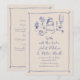 Cette faire-part de mariage est basée sur la tendance populaire dessinée à la main qui propose des plats et des boissons de style français ou italien dans un style fantaisiste, gribouillant, doodle. Ce design est idéal pour un mariage décontracté et décontracté dans un jardin ou un vignoble. Il présente de charmantes illustrations dessinées à la main d'un vase de fleurs, une bouteille de champagne, un gâteau mariage, un porte-bougie et des verres de vin.