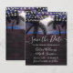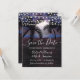 Invitation à ne pas manquer pour un mariage de plage les nuits d'été. Océan, lumières de sable et palmiers sous une pleine lune. Invitation de mariage thème plage subtilement violet et bleu.