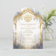 Portail enchanté vers un thème de mariage en forêt aquarelle magique, pour une invitation de mariage de style fantasy mystique, avec une étoile de pentacle de la nature en brindille rustique élégante en or, et typographie dorée. Bleu gris et or.