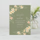 Cette conception présente un fond vert sauge serein orné de délicates fleurs aquarelles pêche et de feuillage vert luxuriant. L'arrangement floral doux crée une ambiance naturelle et aérée parfaite pour un événement printanier ou estival. Des brindilles botaniques élégantes de fleurs de cerisier et de verdure feuillue donnent un esthétique gracieux et organique.