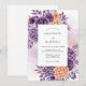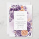 Cette conception présente une riche palette de fleurs d'aquarelle violet foncé et abricot doux. Des roses délicates et des hortensias regroupés sont disposés artistiquement avec un feuillage éthéré pour créer une atmosphère romantique. Un lavis de lavande subtil à l'arrière-plan rehausse l'élégance botanique de la composition inspirée du printemps.