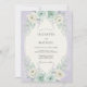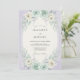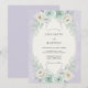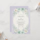 Cette conception présente un fond lavande doux avec une belle disposition de la flore à l'aquarelle. Des roses vert menthe délicates et des fleurs crème sont nichées parmi les feuilles d'eucalyptus argentées et les brins de lavande. La palette de couleurs éthérée de pourpre pastel, de sarcelle et de blanc crée une atmosphère romantique et sereine pour un événement printanier.