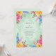 Cette conception présente un fond lavis aquarelle vert menthe doux accentué par des grappes florales vibrantes. Des roses roses et jaunes luxuriantes se combinent avec des delphiniums bleus et des baies rouges délicates pour créer une atmosphère fantaisiste. Le style pictural apporte une touche romantique et artistique à votre jour spécial, parfait pour une cérémonie saisonnière lumineuse.