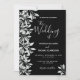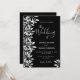 Un faire-part de mariage tendance en noir et blanc et argenté. Un arrière - plan noir chic sur le devant. Décoré de sprigs et de feuillage de couleur blanche et argent botanique. Un grand script à main moderne, typographie avec le texte : Le mariage de. Modèle pour les noms et les détails mariages. Texte blanc. Retour : arrière - plan noir.