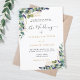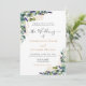 Un arrière - plan blanc décoré de verdure d'eucalyptus aquarellée, de fleurs de lavande et de feuillage doré. Personnalisez et ajoutez vos noms et les détails du mariage. Lettres noires et dorées.