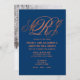 Cette élégante invitation a un monogramme entrelacé en caractères de script dans les nuances de cuivre sur un arrière - plan bleu marine. Photo à l'arrière.