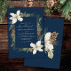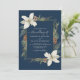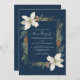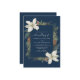 Cônes de pin d'hiver et fleurs blanches sur un bleu marine avec élégant faire-part de mariage de script.