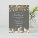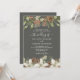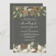 Des cônes de pin d'hiver et des fleurs blanches bordent les bords d'un gris profond avec d'élégantes faire-part de mariage de script.