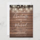 Un élégant faire-part de mariage rustique avec de jolies lampes à cordes, des noms de style signature et une typographie chic sur un arrière - plan rustique en bois. Conçu par Thisisnotme©