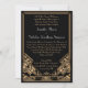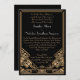 Une faire-part de mariage de style vintage, audacieuse et élégante, avec un thème "Great Gatsby" des années 2000 dans les tons noir et or. Un arrière - plan noir met en valeur la bordure géométrique complexe de style Art Déco dans les tons beiges dorés. Des polices décoratives de style d'époque ont été sélectionnées pour le libellé de votre événement. Les noms de Bride et Groom sont mis en surbrillance à l'aide d'une police de couleur gris argenté contrastée. Sélectionnez le type de papier souhaité pour l'effet complet. Cette version vous permet d'ajouter des noms d'invités individuels ; veuillez noter que cela nécessitera de customiser individuellement chaque invitation.