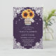Invitations de mariage de tournesol violet rustique avec un tournesol et bouquet de respiration de bébé à l'intérieur d'un bocal de maçon sur un arrière - plan de grange et dentelle. Un design de carte parfait pour inviter vos invités à votre mariage campagnard violet rustique inspiré des tournesols. Carte facile à personnaliser.