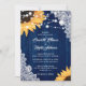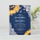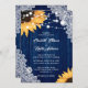 Cet élégant et romantique faire-part de mariage fleuri avec des tournesols contre un arrière - plan en dentelle et en bois de grange est parfait pour inviter vos invités à votre mariage rustique bleu marine de pays/jardin/grange inspiré des tournesols.