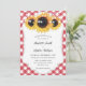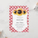 En vichy rouge idéal pour une fête de mariage rustique rouge et jaune inspirée des tournesols. Objets assortis disponibles pour compléter ce faire-part de mariage fleuri avec des tournesols sur un arrière - plan en vichy rouge orné de lampes à cordes.