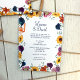 Un mélange floral automne coloré borde cette faire-part de mariage. Lys calles bleu marine et prune pourpre, tournesols or et fleurs de protéa rose sont le bouquet parfait pour vos invitations mariages de automne. La frontière florale comprend même des lys de tigres rose et orange. Ce faire-part de mariage de tournesol d'automne est polyvalent pour les mélanges de couleurs indigo, orange et magenta.