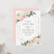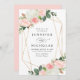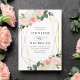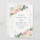Élégantes invitations de mariage florales avec vos détails mariages entourées d'un cadre géométrique en feuille d'or imitation orné de bouquets de roses d'aquarelle rose vif et de tulipes avec feuilles verts luxuriants et en cuivre en haut et en bas. Les invitations à un mariage floral se retournent vers un arrière - plan rose pâle. Conçu pour coordonner avec notre collection de mariages florale de printemps de Blush.