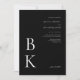 Faites une impression spectaculaire et sophistiquée avec cette faire-part de mariage noire moderne. Conçu avec un arrière - plan noir gras et un texte blanc immaculé, cette invitation met en évidence votre monogramme dans une grande police serif en bas à gauche. Les noms du couple apparaissent dans une police de caractères blanche élégante en haut à droite avec les détails mariages, créant un sens d'équilibre raffiné et le style minimaliste. Le côté inverse est doté d'une mince bordure rectangulaire blanche, placée à partir du bord pour un look propre et encadré. Une version plus petite du monogramme du couple est centrée sur le dos pour une touche finale polie. Idéal pour les couples modernes qui aiment le contraste audacieux et l'élégance intemporelle.