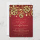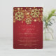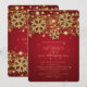 Moderne et élégant modèle d'"Invitation de mariage de vacances Or & Rouge Enregistrer la date", avec des flocons de neige et des lumières à paillettes dorées sur fond rouge.