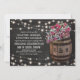 Cartes d'invitation de mariage champêtre élégantes avec un fond de tableau noir rustique, des guirlandes lumineuses, des roses roses et des fleurs de gypsophile, un tonneau en bois de vigne avec vos initiales et un morceau de ficelle nouée.