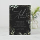 Entrez dans un monde enchanteur avec notre faire-part de mariage décontracté de couronne noir et or verdoyante, parfait pour votre mariage botanique de printemps. Décorée d'eucalyptus vert sauge et d'accents dorés, cette invitation exhale élégance et fantaisie moderne. Imaginez vous promener dans un jardin d'été magique, entouré par les sons apaisants de la nature. Le design saisit sans effort le charme rustique de l'automne avec ses teintes vert clair, évoquant la beauté de la saison changeante. Avec une touche de sophistication minimaliste et une touche bohème classique, les détails chatoyants de la feuille d'or ajoutent une touche de glamour et de romance. Complète avec une atmosphère de conte de fées gracieuse, cette invitation exsude classe et met en valeur la splendeur naturelle de l'automne. N'hésitez pas à nous contacter pour toute question sur le design, et laissez-nous vous aider à faire le mariage de vos rêves.