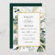 Faire-part de mariage botanique moderne et chic. Belle végétation botanique peinte, cadre en faux or et éléments feuillages dorés avec support couleur vert émeraude coordonnés. L'invitation présente un style design typographique chic mélange de calligraphie et de type audacieux.