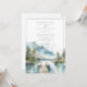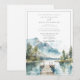Un lac d'aquarelle idyllique en bleu et vert doux, avec une jetée au bord du lac, avec des arbres à feuillage persistant et des montagnes au loin. Rustique et serein. Bordure autour du design. Disponible en version imprimée, en téléchargement numérique ou les deux. Convient pour un mariage de forêt de montagne, mariage de nature extérieure et mariage au bord du lac.